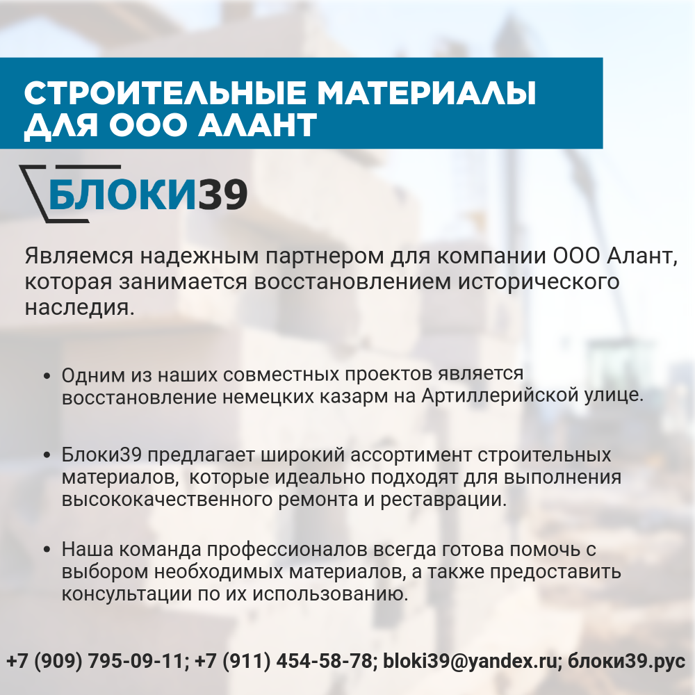 Компания Блоки39 рада представить свои услуги по поставке качественных строительных материалов для проектов различной сложности. Мы гордимся тем, что осуществляем поставку строительных материалов для нашей уважаемой компании ООО Алант, которая занимается восстановлением исторического наследия.
